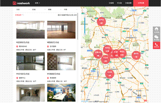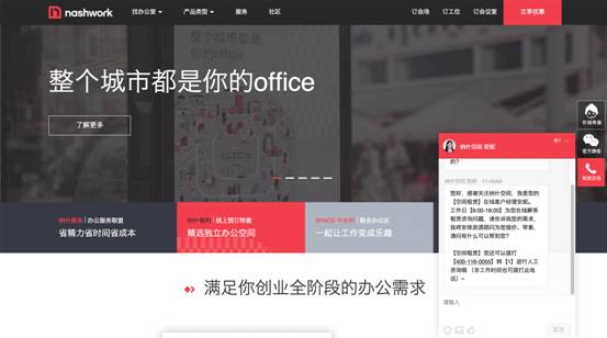 此次改版,纳什空间为新官网接入了在线客服系统,打通了客服人员与官网用户之间的沟通壁垒,取缔了旧版无法实时咨询、只能线下预约参观的方式。在线客服系统与找办公室功能的配合,不仅为纳什空间搭建了一条了解在线用户需求的通道,也方便了客服人员帮助用户及时解惑,更为一线业务人员提供了拓展、维护和服务用户的全新沟通方式。