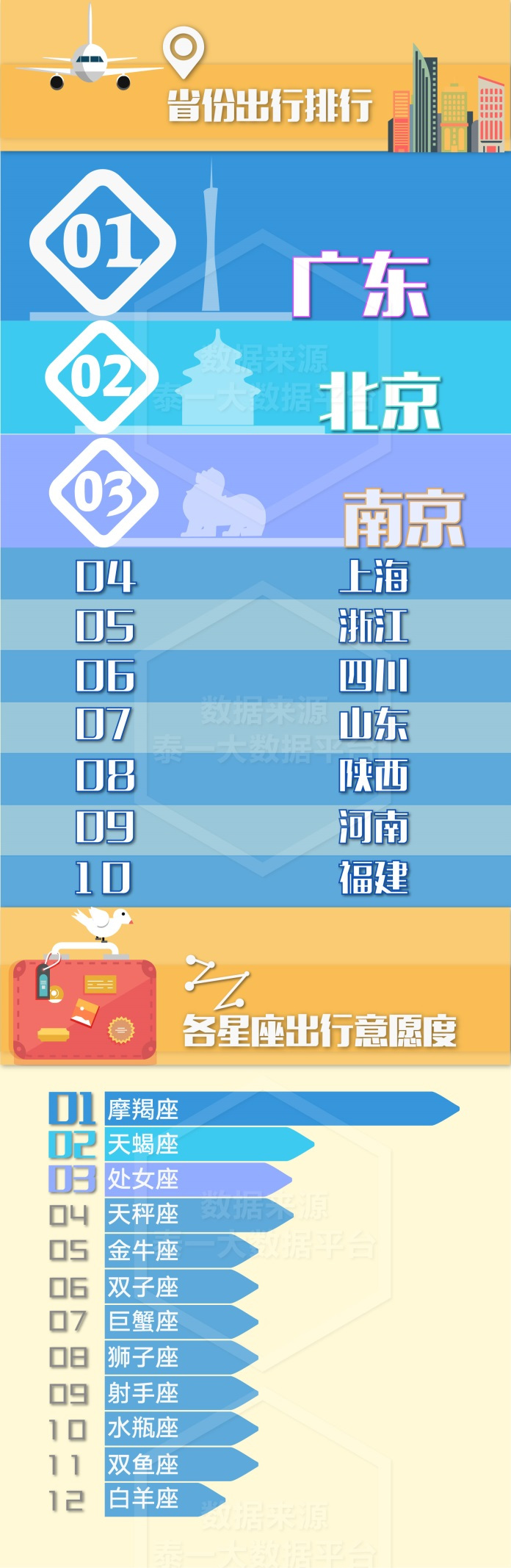 据泰一数据调查显示,在今年国庆出游大军中,近6成为女性游客,19至35岁的群体成为出游消费的主力军,其中,广东、北京、江苏是出游人数最多的三个省份,而在出游人群中,安全可靠的摩羯座成为出游意愿度最高的星座人群。