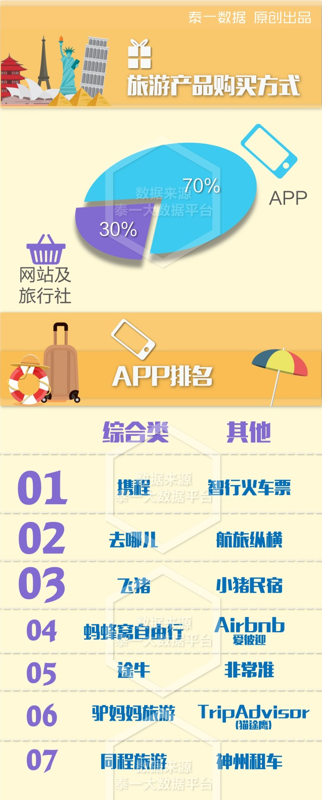 据统计,目前已有超70%的在线旅游者通过APP,随时下单购买旅游产品(机票、酒店、火车票、门票)或者查询求助,黄金周期间,不仅去哪儿、途牛、携程等综合类旅游电商APP保持了稳定的搜索下载,还有如途家公寓、天巡旅行、春秋航空、特价机票等出游专项APP的下载量也有不同程度提高。