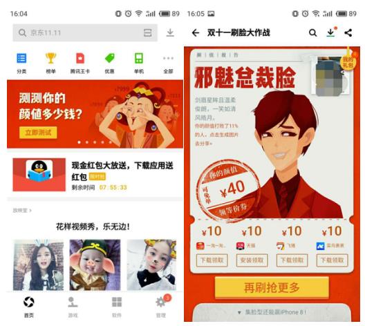 双十一期间,应用宝联合京东、天猫、唯品会、网易考拉、蘑菇街、国美、苏宁等14家头部电商为用户发放16亿壕礼。10月27日开始,用户在应用宝段内通过AI扫脸的玩法,即可领取到包含无门槛优惠券、满减活动、新人大礼包等涵盖数码、家电、美妆等多品类的优惠。