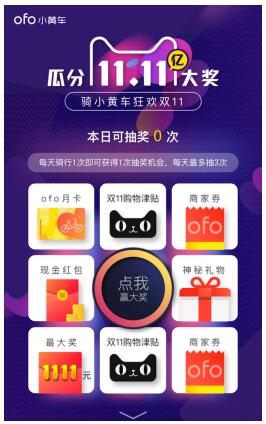 知道今天中午看到同事们骑着ofo小黄车出门,小张才明白是怎么回事。原来在11月6日,ofo小黄车就宣布“瓜分11.11亿元大奖 骑小黄车狂欢双11”超级福利活动正式上线,这一活动发放的福利总金额高达11.11亿元,中奖率高达100%。从11月6日到11月11日24点,凡骑ofo小黄车的全国用户(缴纳押金和信用免押金的用户),每天前3单均可参与抽奖,红包的最大金额可达1111元。