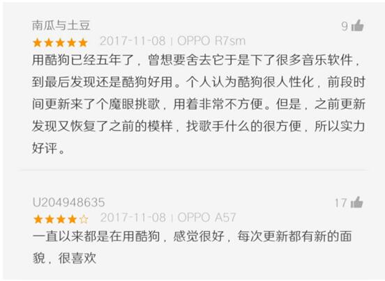 也能看到一些很用心的评论,留言表示已经是酷狗的老用户了,曾在各种各样的音乐软件面前辗转往复过,到最后还是选择了更“人性化”的酷狗,齐全的音乐、实惠的VIP、各种强大的音效让酷狗成了一款“用不腻”的软件。