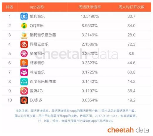 在其他大型应用市场,包括腾讯应用宝和360应用市场,酷狗也是遥遥领先,下载量分别达到17亿次和11亿次,仍甩开第二名不小的差距。
