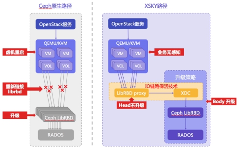 XSKY 提供“Head-Body”升级技术能保证升级过程中业务无感知,其中只用作IO转发的LibRBD proxy 作为“head”被链接到QEMU中,这部分的使用和Ceph原有方式一致,但是在升级过程中保持不变,无需更新;实现主要功能的XDC作为“body”可以跟随版本自由升级,在升级过程中XDC具备的“IO链路保活技术”能保证IO的持续性,使存储升级对前端在线业务无感知。