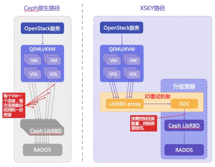 为了解决资源消耗问题,XSKY自研了具有专利技术的XDC模块,提供LibRBD proxy代理,通过代理劫持客户端访问RBD的命令,将无序的访问命令统一管理起来,根据系统资源使用情况按需打开RBD通道,从而达到资源的有效管理。