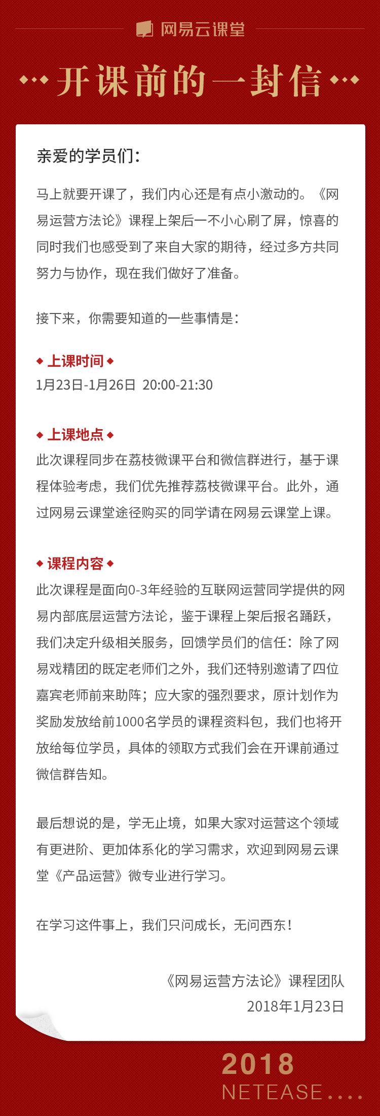 1月16日凌晨,由网易云课堂官方推出、借助荔枝微课平台进行分发的微课程《2018网易开年第一课:网易运营方法论》,在一夜之间引爆了朋友圈,尤其在互联网运营圈引发了普遍关注。一周之后,微课程的第一节课今天(1月23日)将正式开课,中午课程团队发布了《开课前的一封信》,透露了课程准备的相关情况,信中内容显示,课程团队升级了相关服务以回馈众多踊跃报名的学员们,课程内容值得期待。