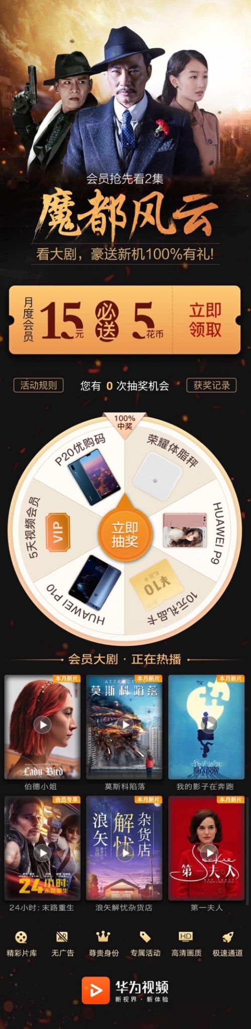 近日,同样以20世纪30年代的上海滩为背景的年代传奇大剧《魔都风云》在华为视频热播,经超、周冬雨、任达华、扈耀等大咖领衔主演,为我们讲述了一段玄妙且非同寻常的上海滩传奇。4月11日——5月3日,登录华为视频看大剧,购买月度会员(15元),还可以参与送花币抽大奖的活动,HUAWEI P10手机、HUAWEI P9手机、荣耀体脂称等好礼等你来拿,100%有奖哦!