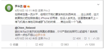 其次在老罗的微博中也可以了解到,坚果R1拍照水平绝对一流,能赶上一流梯队。还有望比苹果手机拍照好两倍。