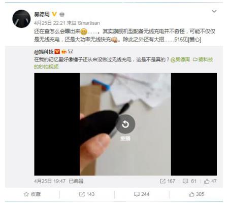 昨晚知名博主“搞科技”在微博视频中猜测锤子科技5月15日的新品旗舰机将采用无线快充,并配文称:“在我的记忆里好像锤子还从来没做过无线充电,这是不是真的?”,随后锤子科技CTO吴德周也转发并坐实了这一猜测:旗舰机型配备无线充电并不奇怪,不仅仅是无线充电,还是大功率无线快充。 除此之外,吴德周还表示坚果R1将会有大招。