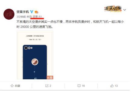 4月25日坚果手机官博发布一条关于《人类完成第一次不系绳太空行走》的微博,微博的小尾巴正式曝光了新品旗舰机的命名——坚果R1。据目前已曝光的坚果R1各项性能,坚果R1或是上半年最值得入手的旗舰机。
