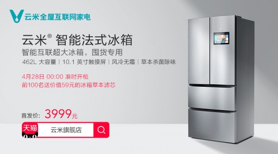 云米智能法式四门冰箱已于4月28日00:00,云米天猫旗舰店首发,首发价3999元,4月28日-5月2日首发期间购买,前100名送价值59元的冰箱草本滤芯。