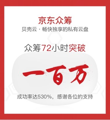 经过将近1年的研发与优化,6月11日上午9:00,贝壳云正式登陆京东众筹,上线1小时就达成100%众筹完成率,24小时内更是直接突破60万。截止发稿前,众筹支持金额已突破100万人民币。这无疑是消费者对贝壳云优越性能与超高性价比的高度肯定,也与京东众筹官方的大力支持息息相关。
