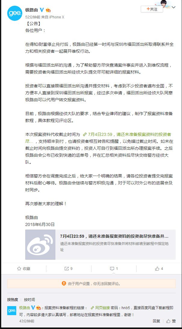 对于合作方停止兑付,极路由这边也作出了公告,与深圳福田派出所取得联系,并与相关投资者一起展开维权行动。