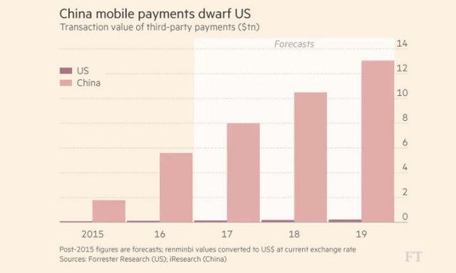 随着小微商户的接入,2016 年中国移动支付交易金额达到 5.5 万亿美元,是美国(1120 亿 美元)市场的近 50 倍。