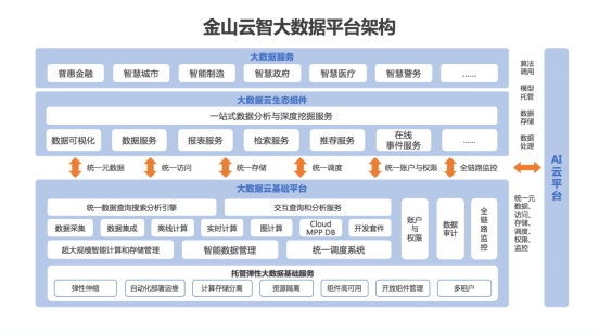 此次推出的“金山云智”大数据云,通过积极引入人工智能、区块链等多项前沿技术,打造基于云端的大数据产业服务。通过在主流Hadoop、Spark框架之上构建端到端的大数据开发闭环,提供数据集成、数据管理、数据开发、作业调度、数据分析及可视化等一站式大数据Web化处理环境,具备统一管理、资源云化、超大规模部署、敏捷开放、安全和高效六大特征,有效解决传统大数据处理中面临的信息孤岛、规模和性能瓶颈、使用门槛高等难题,