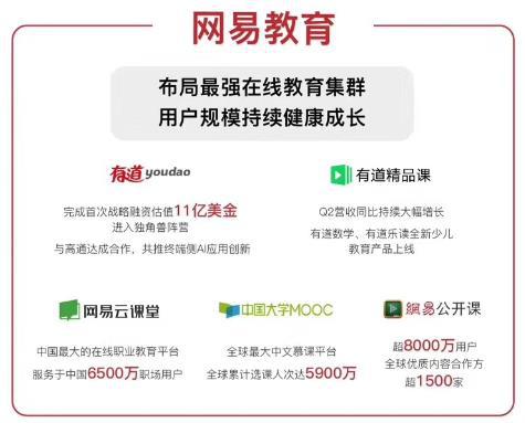 目前,网易构建了国内为数不多的覆盖用户终身学习需求的教育产品矩阵,众多领先的在线教育产品,形成覆盖K12、在校大学生、职场人士及知识爱好者群体的产品闭环,成为广度、深度最强的在线教育产品集群。