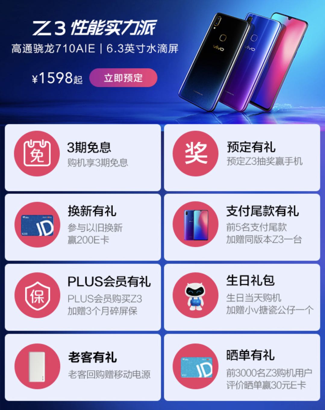 如今,这款集合vivo、京东双方营销优势和品牌优势的实力派新品vivo Z3,即将在11月1日零点vivo京东自营官方旗舰店准时开售,想要体验超强的性能实力派新机,同时享受超值购物优惠的用户