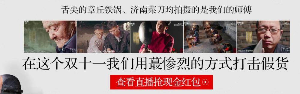 根据每日经济新闻的报道,双11前夕,因《舌尖3》爆火的章丘铁锅再次陷品牌内讧。为了迎接双11,“章丘铁锅”品牌运营商三环厨具在电商平台“臻三环旗舰店”贴出了宣传语:“在这个双十一我们用最惨烈的方式打击假货”,并且还称,要“超低价疯打假货”。除此之外,臻三环还请出了冯全永、王玉海、张宏亮、刘永峰、冯春有五位非遗传承人为其站台。