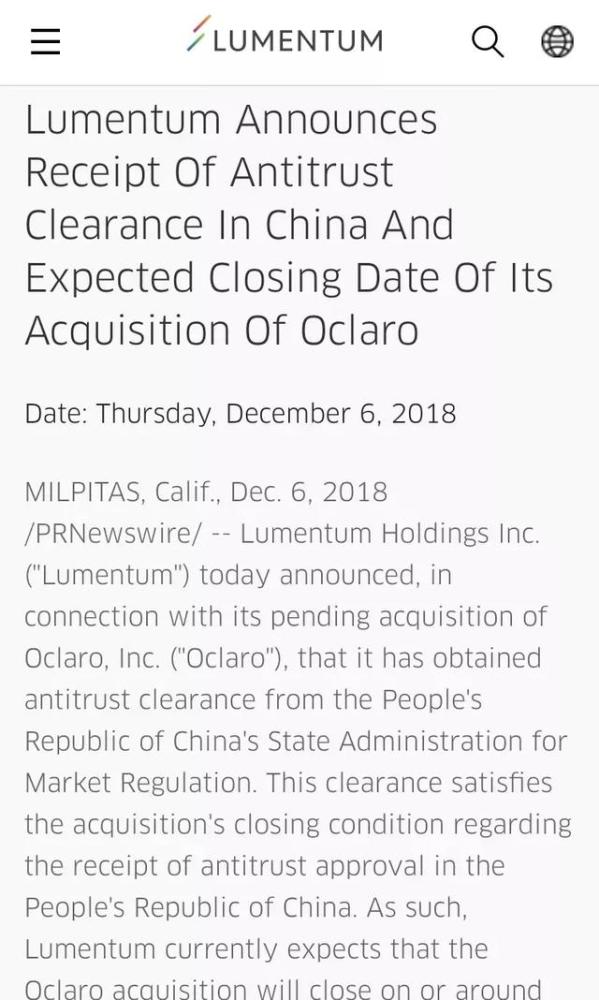 全球领先的光电子、光学元件及子系统制造商Lumentum,12月6日在其官方网站上宣布,中国反垄断机构已经批准公司以18亿美元收购光器件厂商Oclaro的交易案。Lumentum方面表示,预计将于2018年12月10日完成这笔交易。