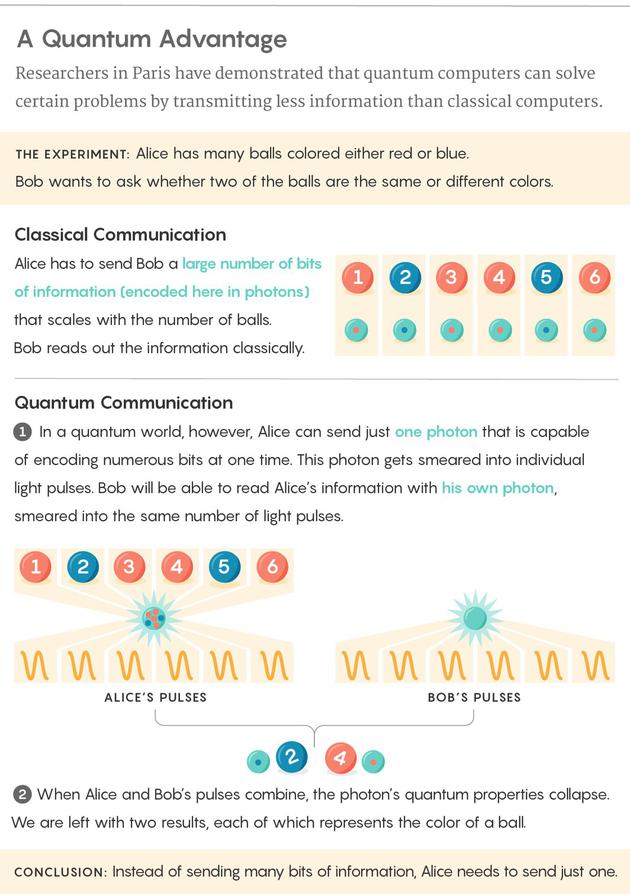 如果以经典方法解决上述问题,A需要发送给B的信息数量需要与小球个数的平方根成正比。但量子信息的奇异性质则为我们提供了一种效率更高的解决方案。