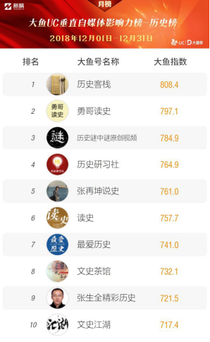 1月“大鱼UC榜单”分榜——历史榜