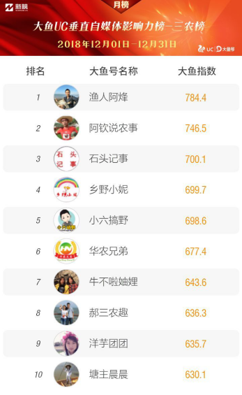 1月“大鱼UC榜单”分榜——三农榜