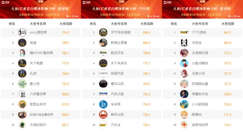从榜单中可以看出,本期不止有用户们熟悉的老牌创作者,还涌现了大量的“新面孔”,如旅游榜的“天下有景”、“饭道”,汽车榜的“天下有车视频”、“天下未来车”,游戏榜的“17173游戏”、“王者小信”等各领域优秀创作者。他们在大鱼号持续深耕优质作品,在过去的一月中凭借自己的不懈努力,在本期榜单崭露头角。