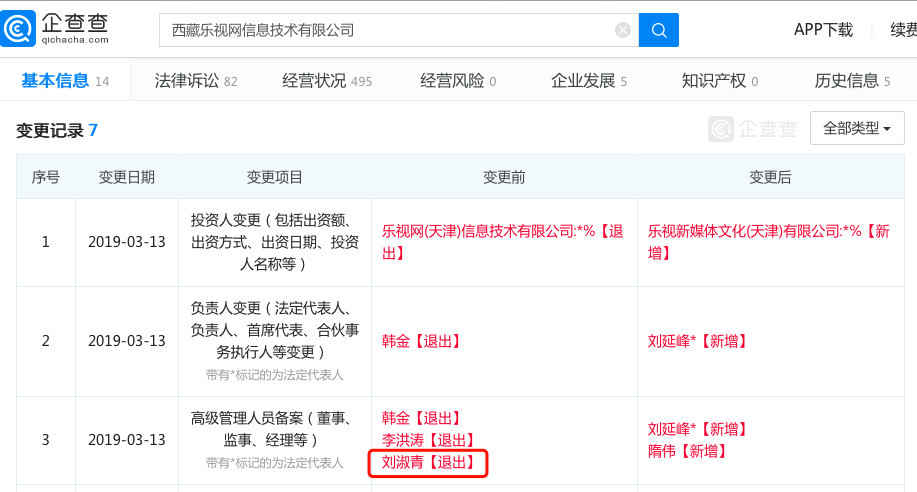 3月19日消息,据企查查数据显示,乐视网全资子公司“西藏乐视信息技术有限公司”于3月13日发生多项股东变更,其中大股东从“乐视网(天津)信息技术有限公司”变更为“乐视新媒体文化(天津)有限公司”,原法人代表韩金卸任,由刘延峰继任。