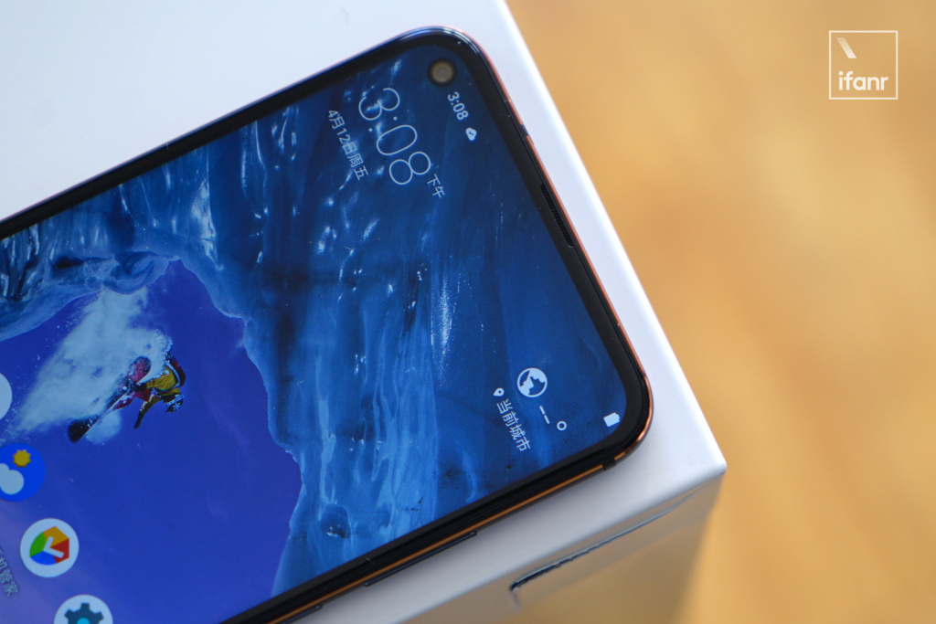 屏幕上最显眼的自然是位于左上角的前置摄像头了,打孔方案看起来应该不是通孔,孔径不大,比采用了通孔设计的三星 A8s 要小上不少,应该是采用了盲孔的方案。但是这个打孔的位置和屏幕的圆角弧度并没有在一条线上,对于强迫症患者来说可能会感到有点难受。
