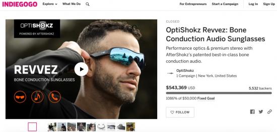 3月5日在世界上最大的众筹网站之一Indiegogo开启众筹之后,AfterShokz韶音旗下第一款骨传导太阳眼镜Revvez的众筹即将于落下帷幕。在一个多月的众筹时间里,这款极具创新性的可穿戴设备,收获了海外用户的疯狂追捧。最终,有超过5500名用户参与支持了这一众筹项目,众筹金额已经超过54万美元,超过众筹目标金额的10倍,绝对是亮眼表现!(编者注:该款产品在国外采用AfterShokz韶音的子品牌OptiShokz,国内市场仍然采用AfterShokz韶音品牌)