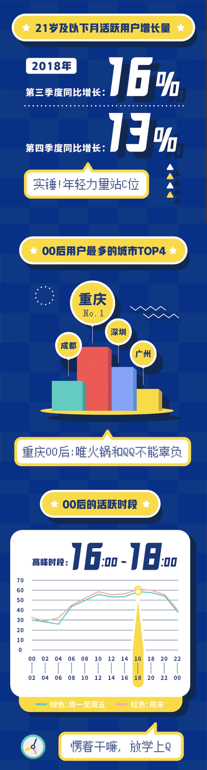 根据2018年第三、四季度腾讯财报数据显示,QQ上年龄为21岁及以下用户的智能终端月活数量实现同比持续稳定增长。作为移动互联网时代的原住民,00后们逐渐开始在QQ上打开了线上社交的大门。每天午休和下课放学时段,成为00后用户登陆高峰期,放学上Q成为一种日常。同时,山城重庆登顶,成为00后用户最活跃的城市。