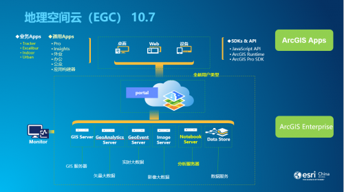 从上图可以看到,地理空间云框架支持多领域,多模式的空间应用。首先是GIS,大家可能习惯叫它传统的GIS,或者专业化的GIS。其次,还可以支撑位置智能服务,我们叫LBS或者叫Location Management。同时,还能够继续支持一种新的领域,我们把它叫做地理赋能的业务系统——Geo-Enabled Systems,比如城市规划、室内地图、商业分析等等。它更多地面向业务,面向应用,并为它们赋予地理的能力。