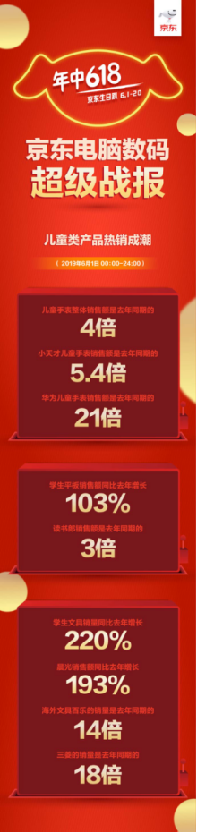 借势6.1儿童节,京东电脑数码618开门红当天儿童类产品表现极为优异,儿童手表销售额是去年同期的4倍,学生平板销售额同比去年增长103%。同时,众多海内外品牌商在京东的销售额增势可喜,小天才儿童手表的销售额达去年同期的5.4倍,读书郎学生平板销售额是去年同期的3倍,华为儿童手表销售额更是高达去年同期的21倍!其中,华为儿童手表3 Pro与小天才儿童电话手表Z5q以其优异的性能表现更受消费者欢迎。