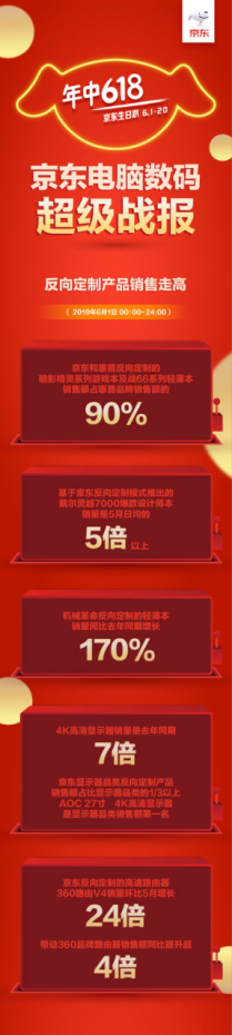 值得关注的是,更符合消费者细分需求的反向定制类产品也取得了优异的表现,在京东电脑数码618开门红1小时战报中,京东独家反向定制的惠普暗影游戏本系列+战66轻薄本系列销售额占惠普品牌销售额的90%,戴尔灵越7000爆款设计师本销量是5月日均的5倍以上,机械革命反向定制的轻薄本销量同比去年同期增长170%。