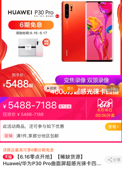 华为618,伴你更好,6月16-17日活动期间,购买华为P30系列均可享受6期免息福利,更有天空之境、赤茶橘等稀缺版本供应。想要了解更多优惠信息,可以复制下方天猫口令,进行详细了解!