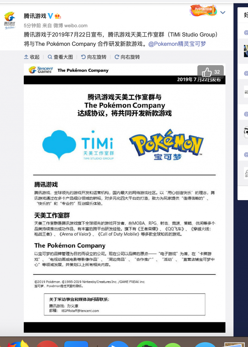 腾讯游戏官方宣布,天美工作室群将与 The Pokemon Company(宝可梦公司)合作开发新游戏,但腾讯方面公布的文件并没有说明此次将与宝可梦公司合作的具体项目。