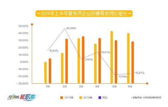 58同城招聘研究院数据显示,2019年1-6月,有招聘需求的餐饮企业同比增长46.18%,尤其在2月份需求增长明显。在招聘岗位上,服务员需求量仅次于销售岗位。同时,大量求职者在春节假期后选择换工作来开启新生活,餐饮行业求职者数量在2月份增长显著。