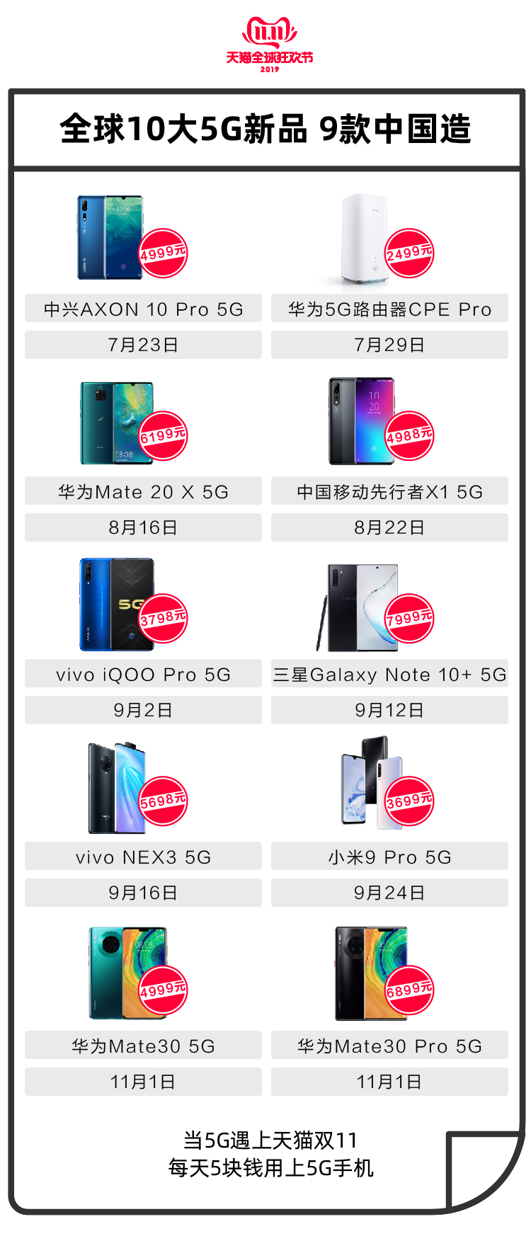 砍柴网讯 当5G遇上天猫双11,全球5G新品扎堆天猫首发。据悉,天猫双11将集结华为Mate 30 5G、vivoNEX3 5G、三星Note 10+ 5G等全球已上市的十大5G新品,值得一提的是,这其中有9款为国货产品。