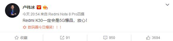 不只是小米品牌有多款 5G 手机,Redmi 红米显然也会是小米旗下 5G 手机的主力。今晚红米总裁卢伟冰更是放言—— Redmi K30 一定会是 5G 爆品,放心!