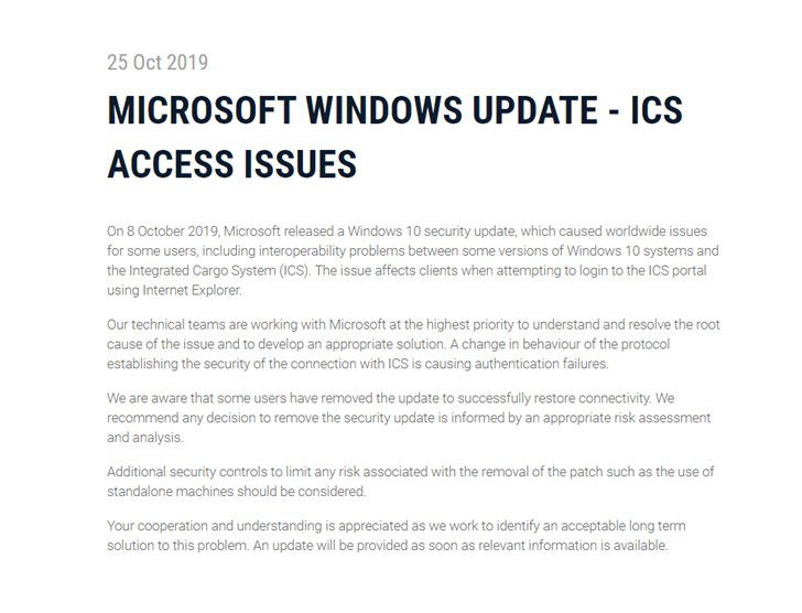 具体而言是当 ABF 工作人员在安装了 Windows 10 的 10 月 8 日安全更新后不能通过 Internet Explorer 连接到自己的综合货运系统(ICS)。尴尬的是澳大利亚边防部门系统仅支持 Internet Explorer,因此此次更新问题导致的系统出错对澳大利亚边防部门的工作造成了极大影响。