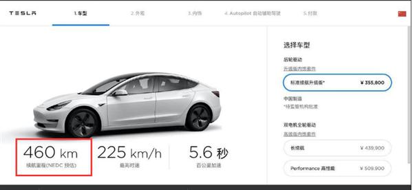 调整前特斯拉官网显示标准续航版本的续航里程为 460km