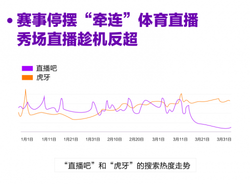 与此同时,直播领域的格局也在悄然改变。作为直播领域的两大根基,秀场直播与体育直播一直不分伯仲。但过去两周,疫情导致了全球大量体育赛事接连停摆甚至取消,甚至连奥运会也被迫延期一年,体育直播也因此受到“牵连”,最终被秀场直播反超。