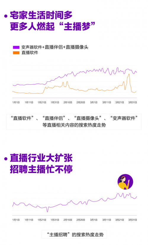 另一方面,由于宅家的关系,有更多人在疫情期间燃起“主播梦”。数据显示,主播必备的“直播软件”、“直播伴侣”、“直播摄像头”、“变声器软件”等相关内容的搜索热度在疫情期间一路走高,“主播招聘”的搜索热度也在相应攀升。