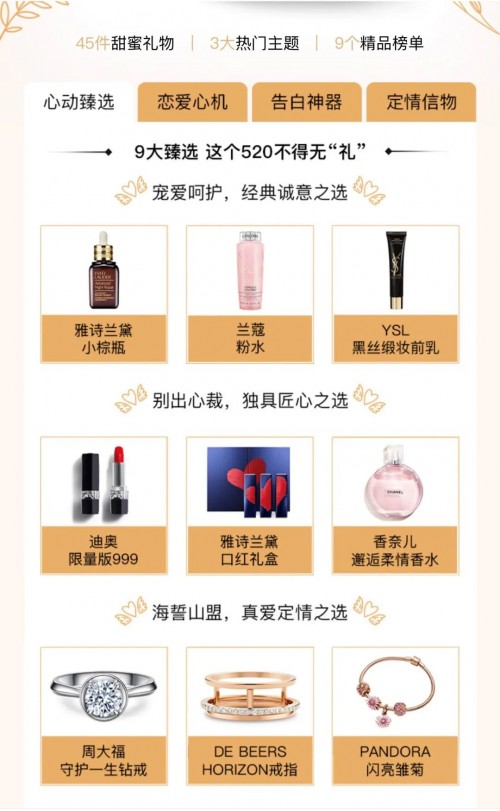 榜单精选45件甜蜜礼物、3大热门主题、9个精品榜单,从限量版迪奥999、迪奥小姐香水、圣罗兰小金条N°21、香奈儿香水等女神必备美妆单品,到雅诗兰黛小棕瓶、SK-II小红瓶精华、兰蔻粉水等护肤精选,到周大福钻戒、PANDORA雏菊手链等精美饰品一应俱全。无论是礼物表白、热恋示爱,还是追求婚姻中的仪式感,总有一款好物击中女神心!