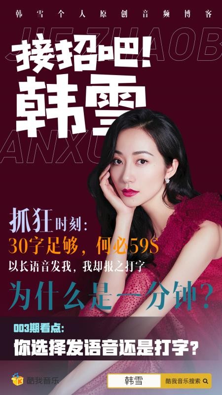 全网最火的明星互动原创音频播客,本周开更“语音杀手图鉴”!被微信聊天“长语音”支配的恐惧,已经堪称为现代人类关系恶化的致命武器,在酷我音乐《接招吧!韩雪》节目留言中,这一问题名列前茅成为吐槽冠军。本周,韩雪就与听众正式开聊“时间话题”,对于那些爱发59秒长语音的人群,该怎样出招应对?韩雪独家锦囊妙招奉上!