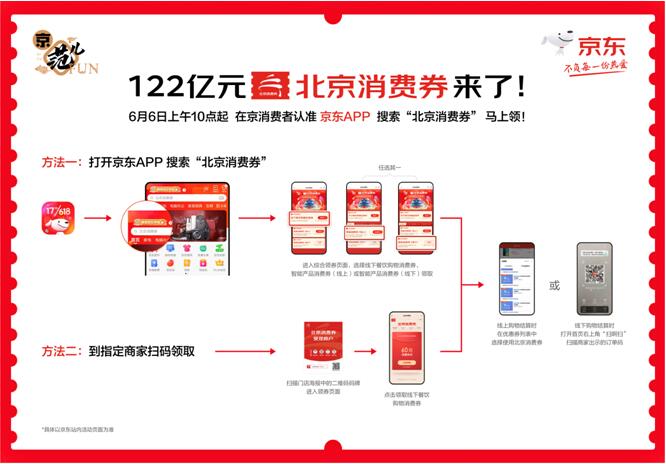6月6日,北京消费季正式启动,价值122亿的电子消费券发放工作也将全面开启,作为本次消费券发放平台,6月6日上午10点,消费者只要打开京东APP,搜索“北京消费券”即可领取,其中包括200万张用于线下餐饮、购物的专项消费券和100万张线上线下通用的智能产品消费券,消费者可以在领后14天内于活动范围内商家消费使用。