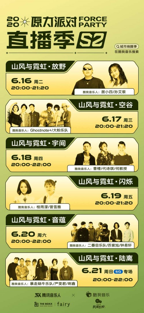本周主题“山风与霓虹”很好的诠释了民谣存在,当城市沉睡霓虹蒙上灰尘,在这个夏日时分城市从睡梦中被唤醒,山风吹过楼宇便成了森林,霓虹闪烁便是音符的跳动,山风所及就是音之所向。在本周中,“放野”、“空谷”、“宇间”、“闪烁”、“音蕴”、“陆离”作为唤醒线索轮番上阵,共进行6场线上直播,在周日5G专场中,将继续还原Live House现场体验。