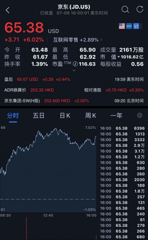 北京时间7月9日,京东(JD.US)大涨6%,股价创历史新高,达到65.9美元,总市值约1016.62亿美元,首次站上千亿美元。