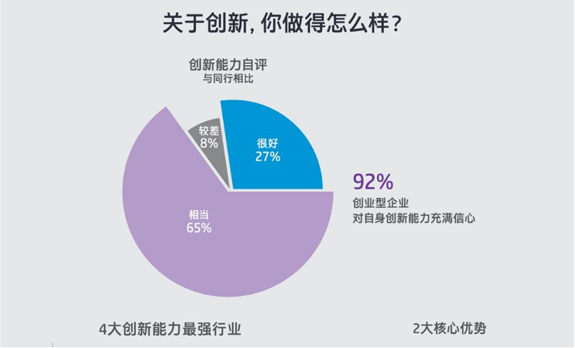 · 创新力与业绩正相关,创业企业对自身创新能力十分乐观:当前我国创业型中小微企业创新业绩总体向好,超过92%的受访企业表示自身创新能力优于同行,展现出对自身创新水平的自信。同时,创新业绩与创新战略、企业管理水平及企业规模呈正相关, 说明创新是我国中小微企业生存发展的原动力,也是成长的必由之路。