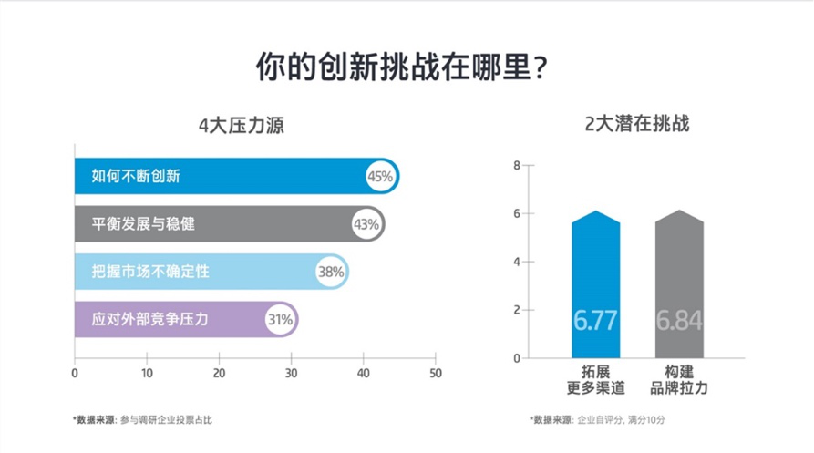· “黑天鹅”之外,创业企业还面临四大挑战:参与访谈的企业中,约有45%的企业表示压力来自于如何持续创新,43%的企业认为主要挑战在于如何平衡快速发展带来的一系列问题,38%的企业认为市场的不确定性是企业发展的主要风险之一,还有31%的企业承受着巨大的外部竞争压力。